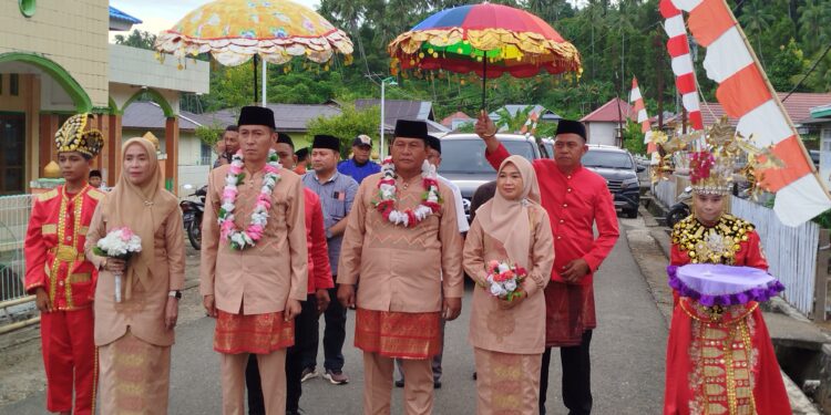 Bupati dan wakil Bupati di dampingi oleh Ketua TP-PPK Ny. Selpian Kamaru Manoppo dan Sekertaris TP-PKK Ny. Rosdiana Abdul Hamid Lapatola di jemput dengan poses Adat Gorontalo pada Kamis, 20 Maret 2025.