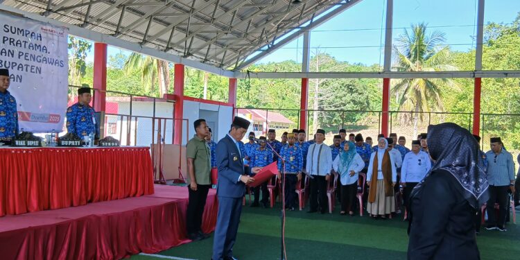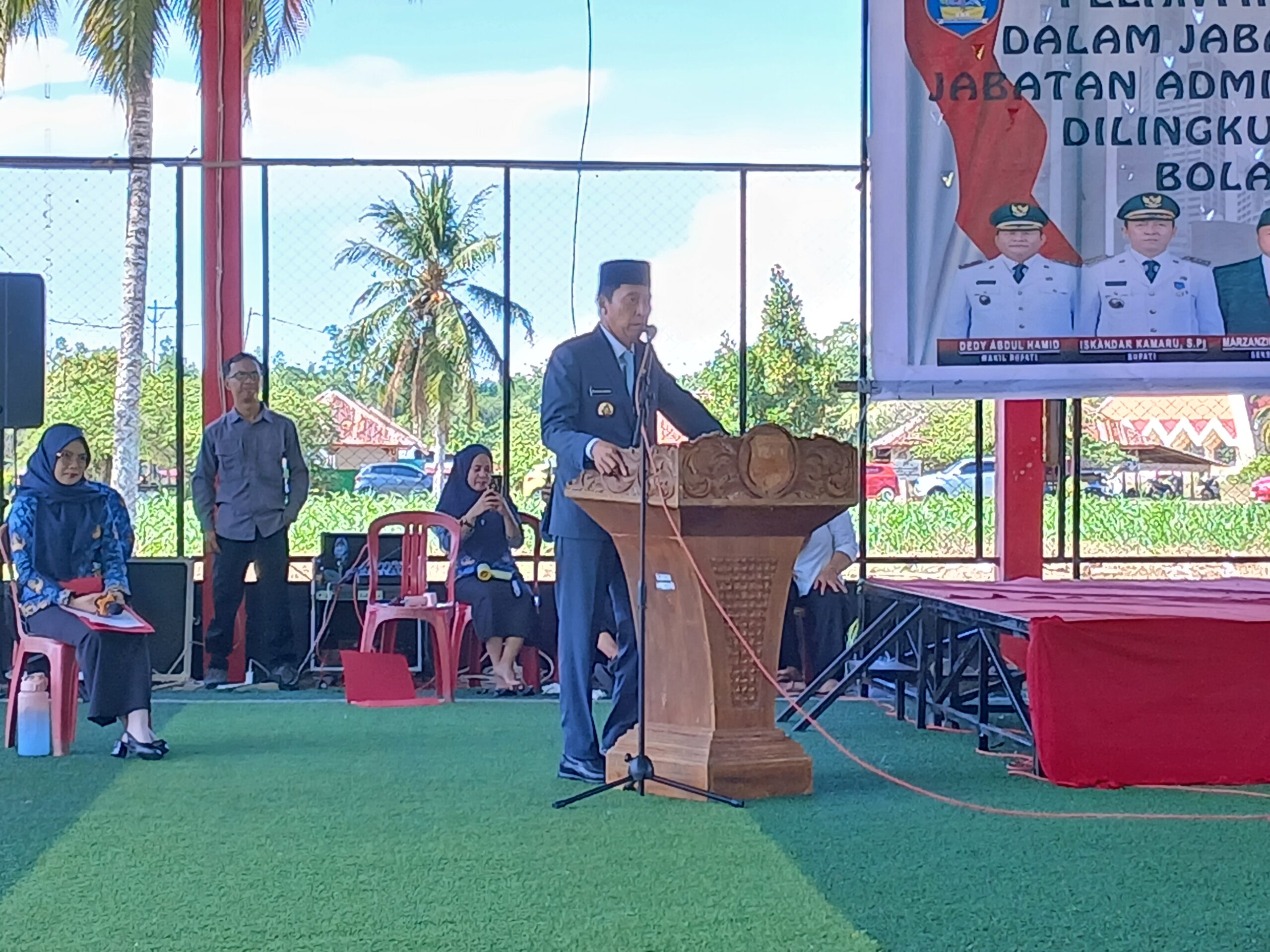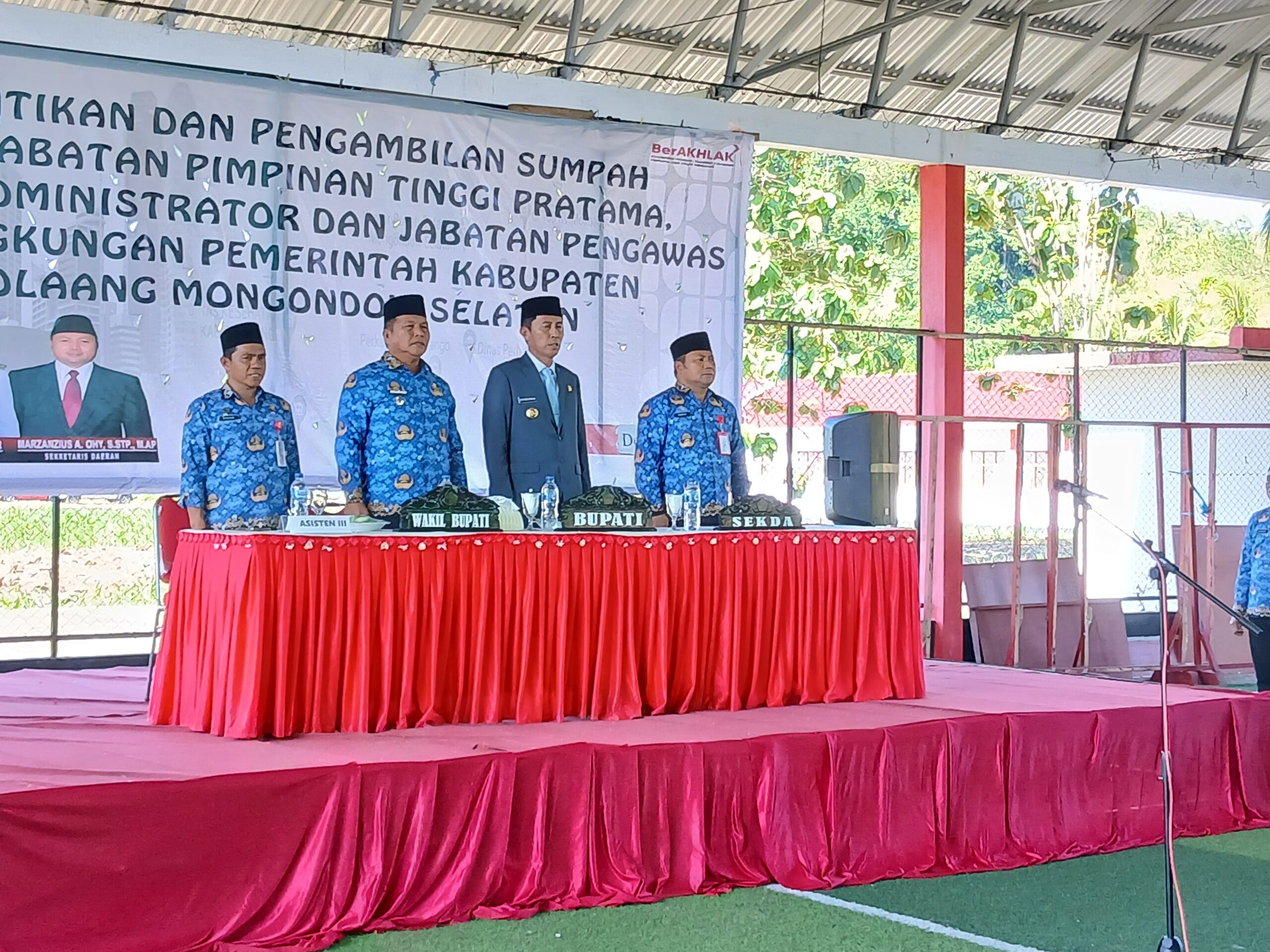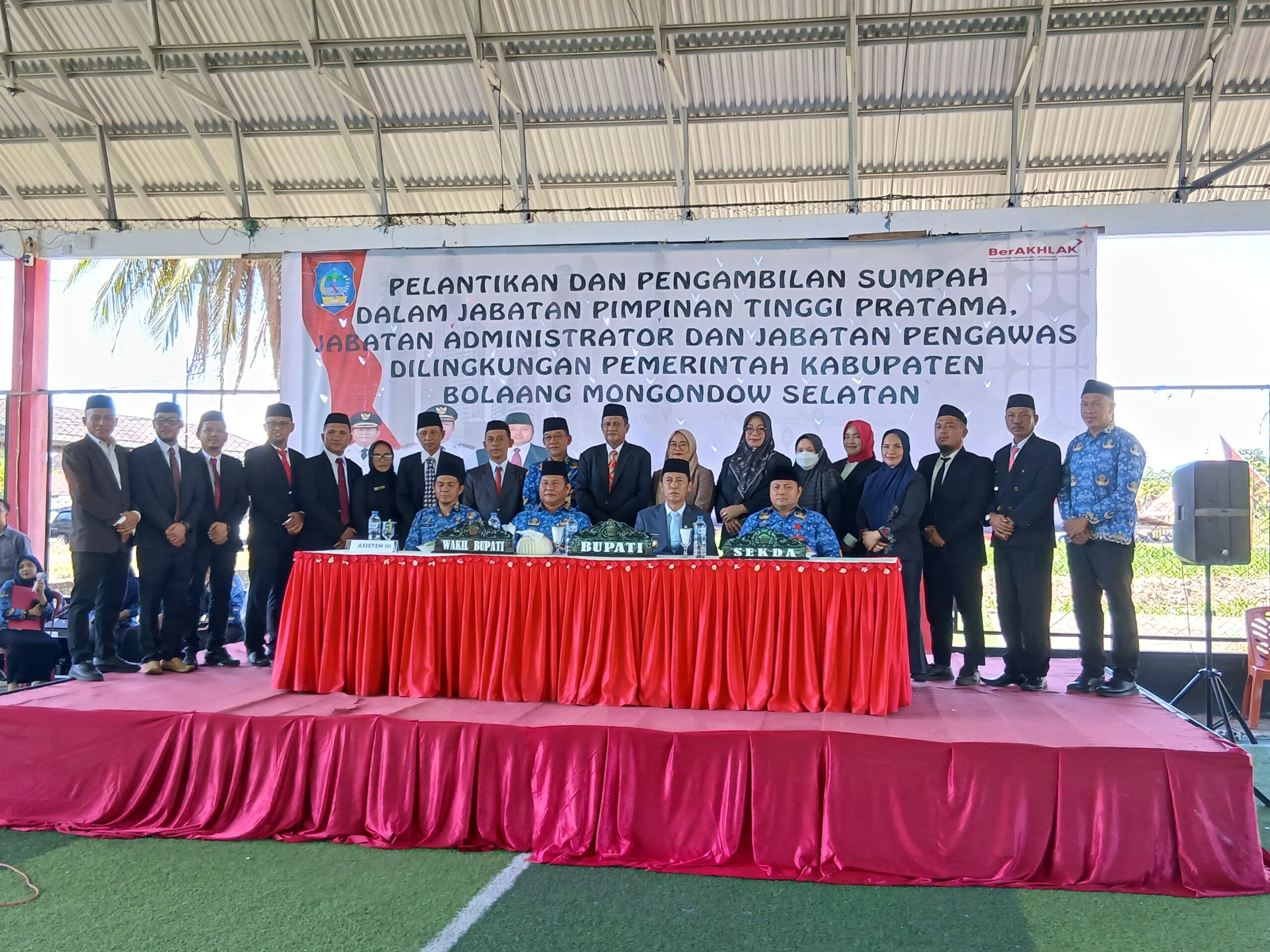 SELATANTIMES.COM-BOLSEL-Bupati Bolsel H. Iskandar Kamaru, S.Pt. M.SI di dampingi Wakil Bupati Deddy Abdul Hamid melantik Sejumlah pejabat Tinggi Pratama, Administrator, Pengawas dan Fungsional di lingkungan Pemerintah Daerah Kabupaten Bolaang Mongondow Selatan (Bolsel). Pelantikan ini berkangsung dilapangan Futsal Kawasan Perkantoran Panango, Kecamatan Bolaang Uki pada, Senin (22/12/2025).