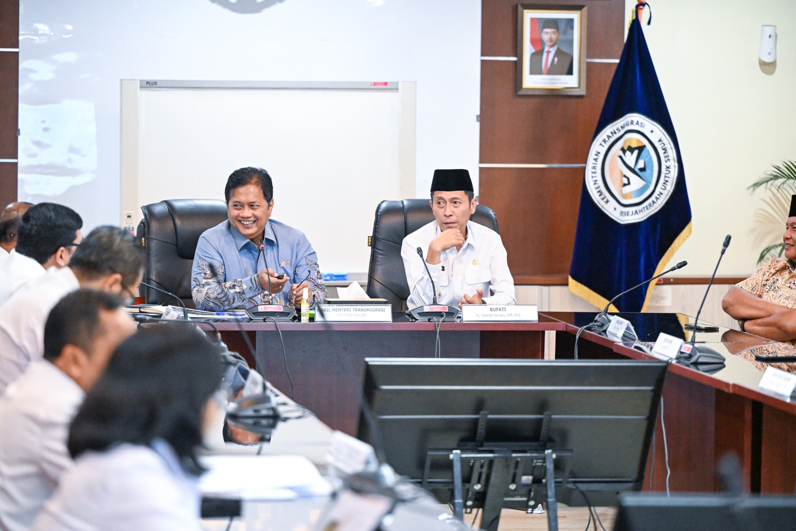 Dalam kesempatan ini, Bupati Iskandar memaparkan potensi wilayah, kesiapan lahan, dukungan regulasi daerah, serta rencana pengembangan infrastruktur dasar dan sarana pendukung kawasan transmigrasi.